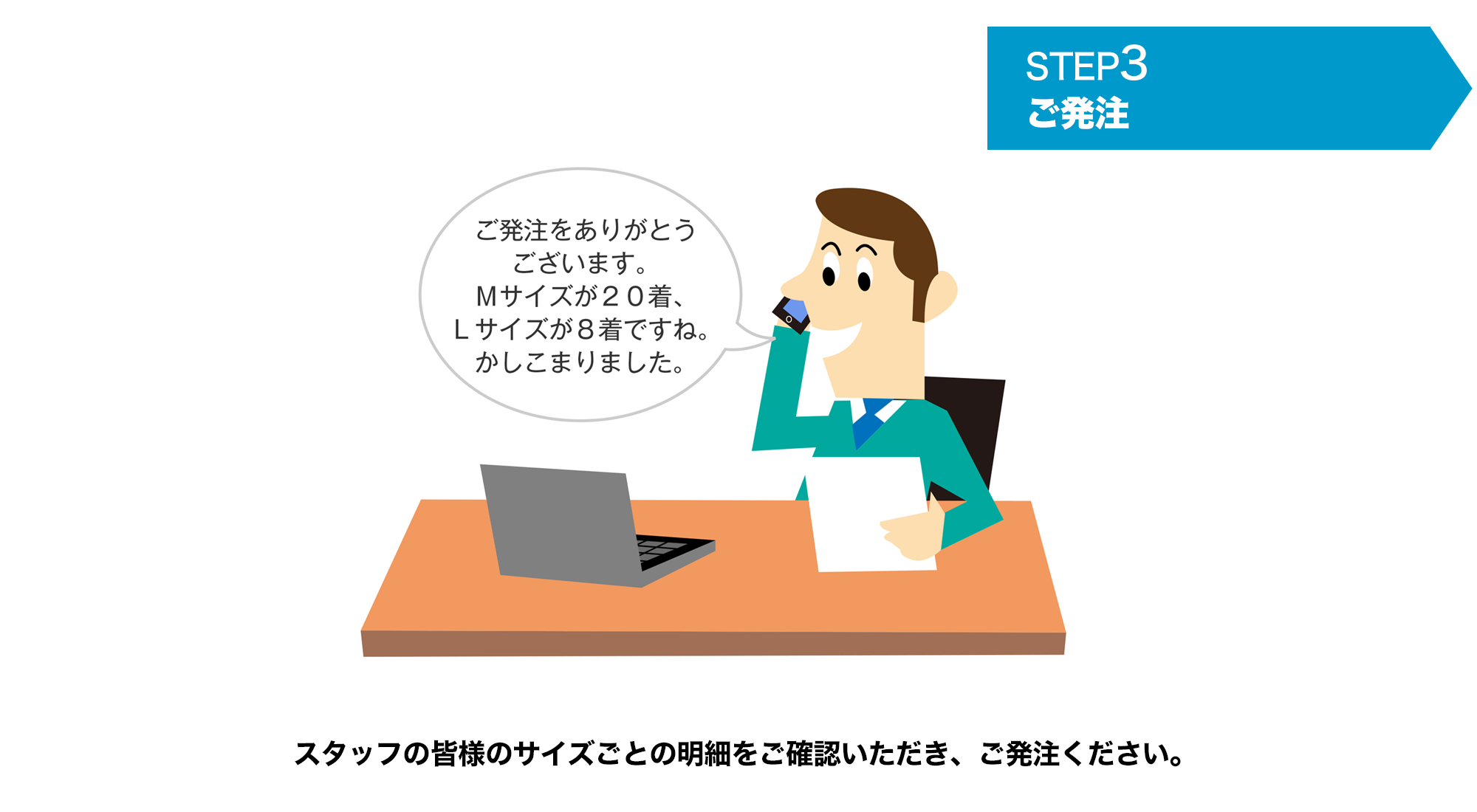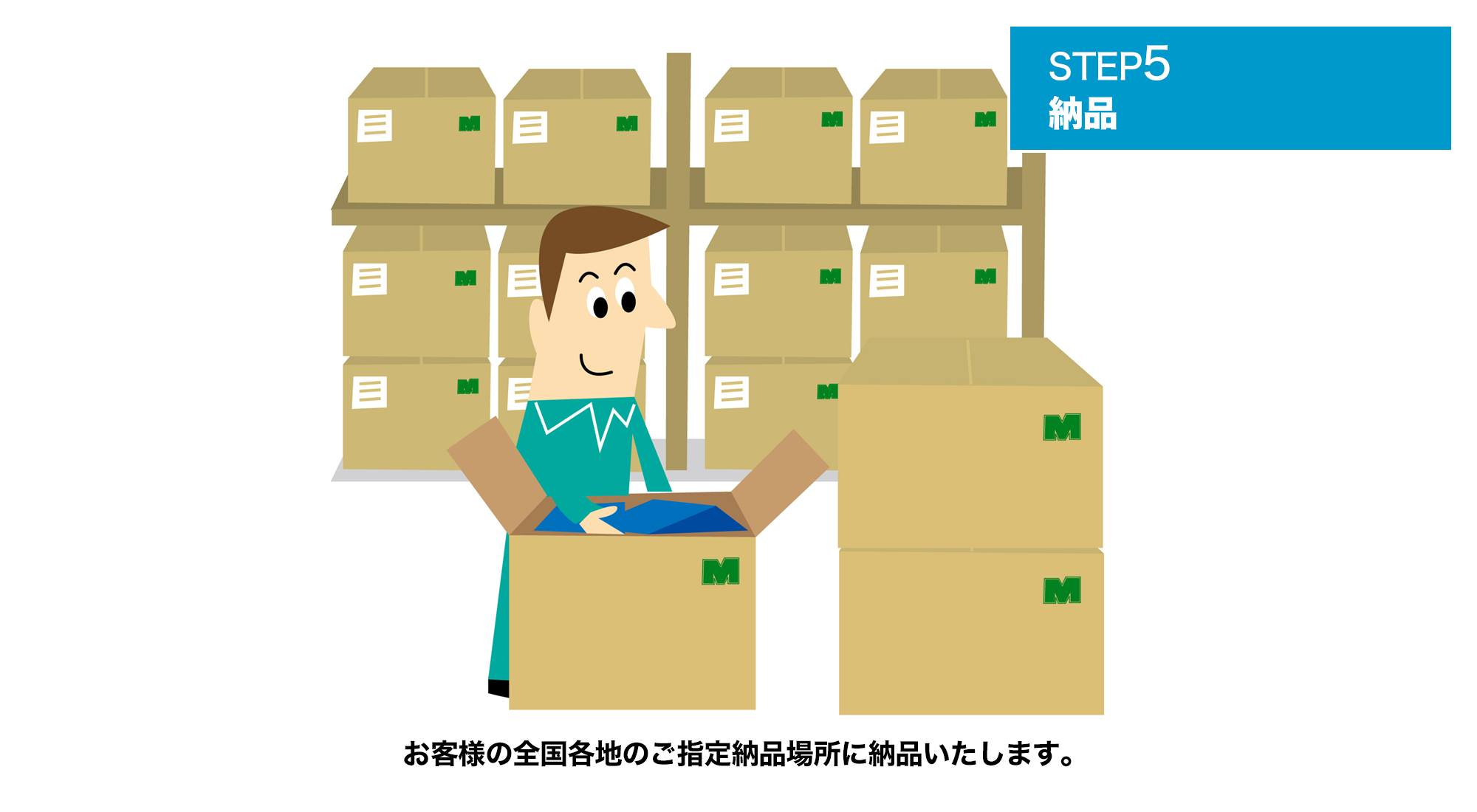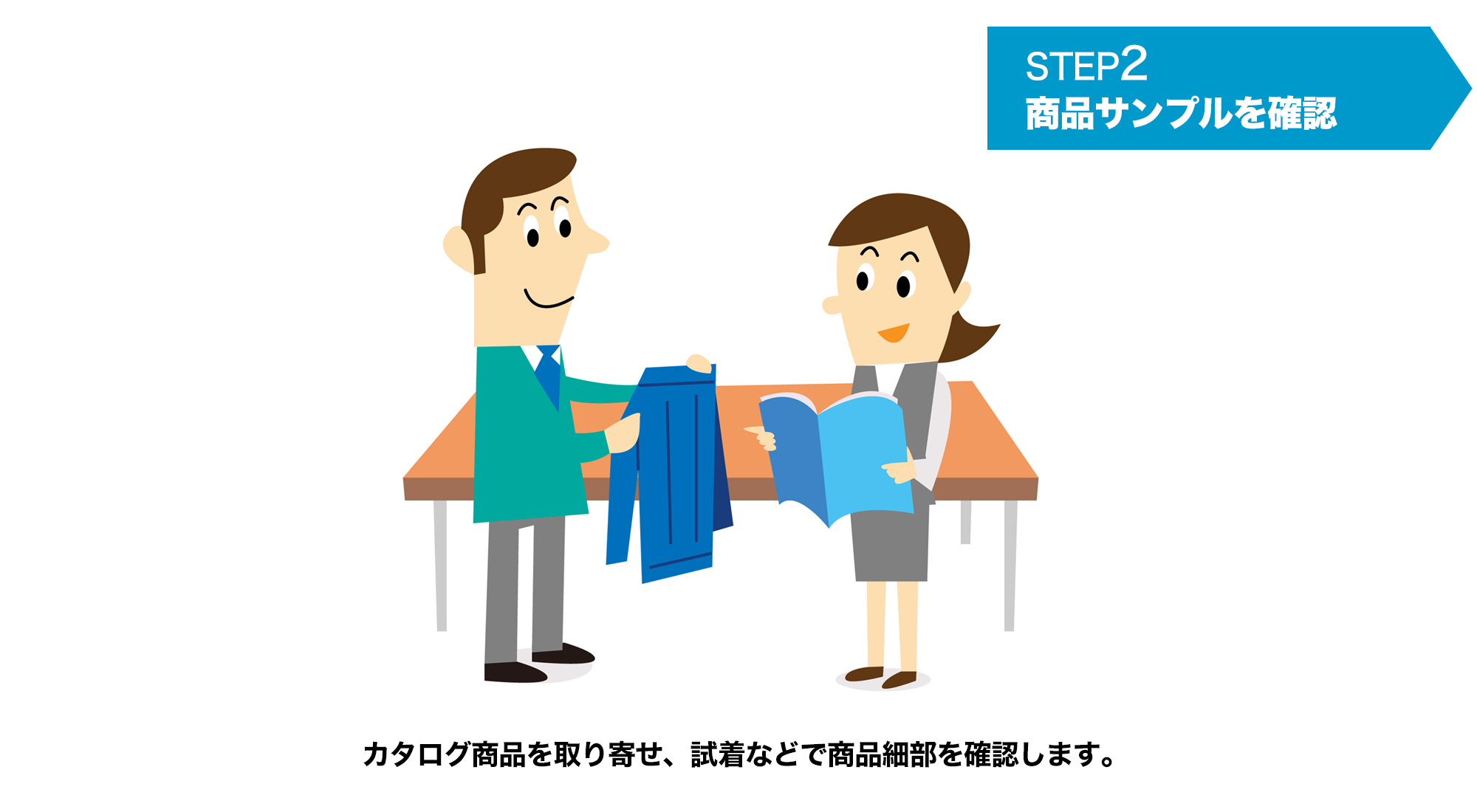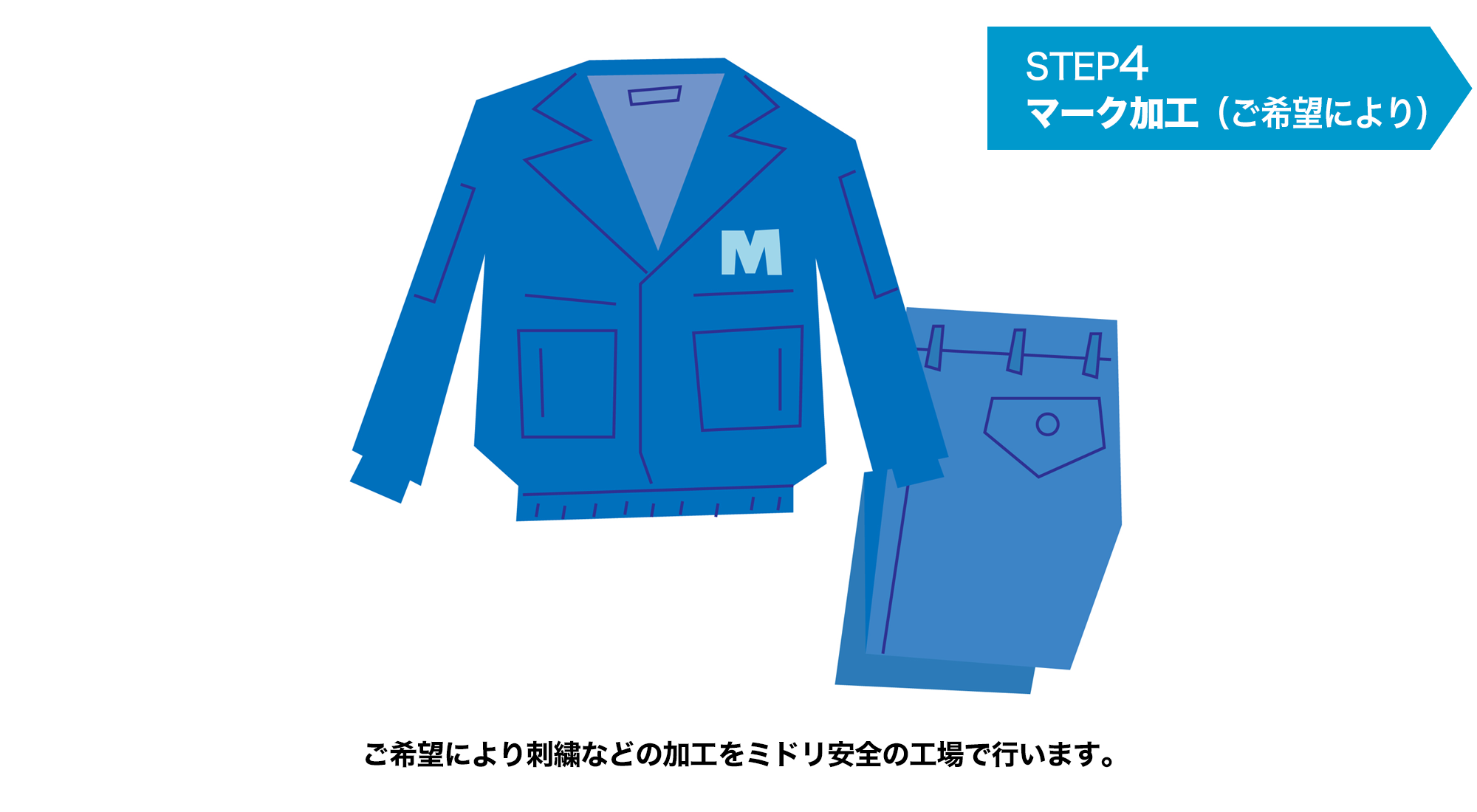 カタログ定番ユニフォームが、お客さまのお手元に納品されるまでの流れをご紹介します。 マーク加工も承っております。カタログは無料で送付致しますので、お気軽にお申し付けください。
